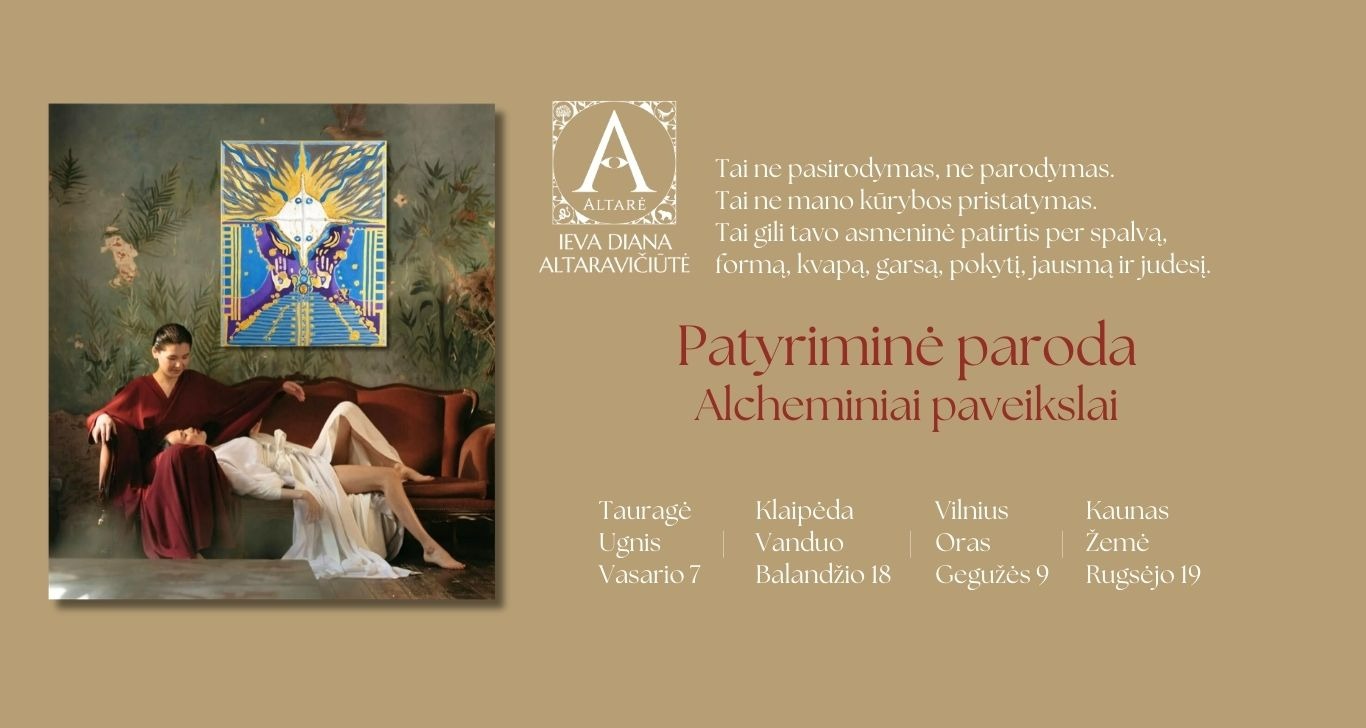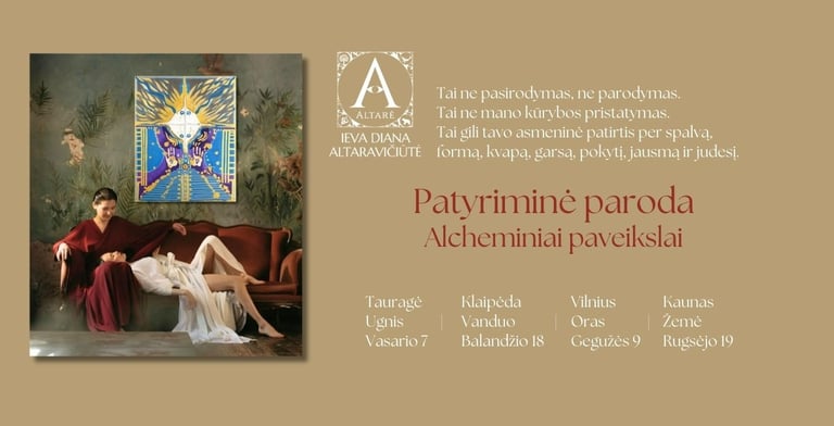 Visose erdvėse rasi mano Alcheminius tapybos kūrinius, tačiau tai ne tik paroda. Tai keturių elementų Patyriminė kelionė, kurioje kiekvienas susitikimas atveria naują tavo vidinio pokyčio etapą.